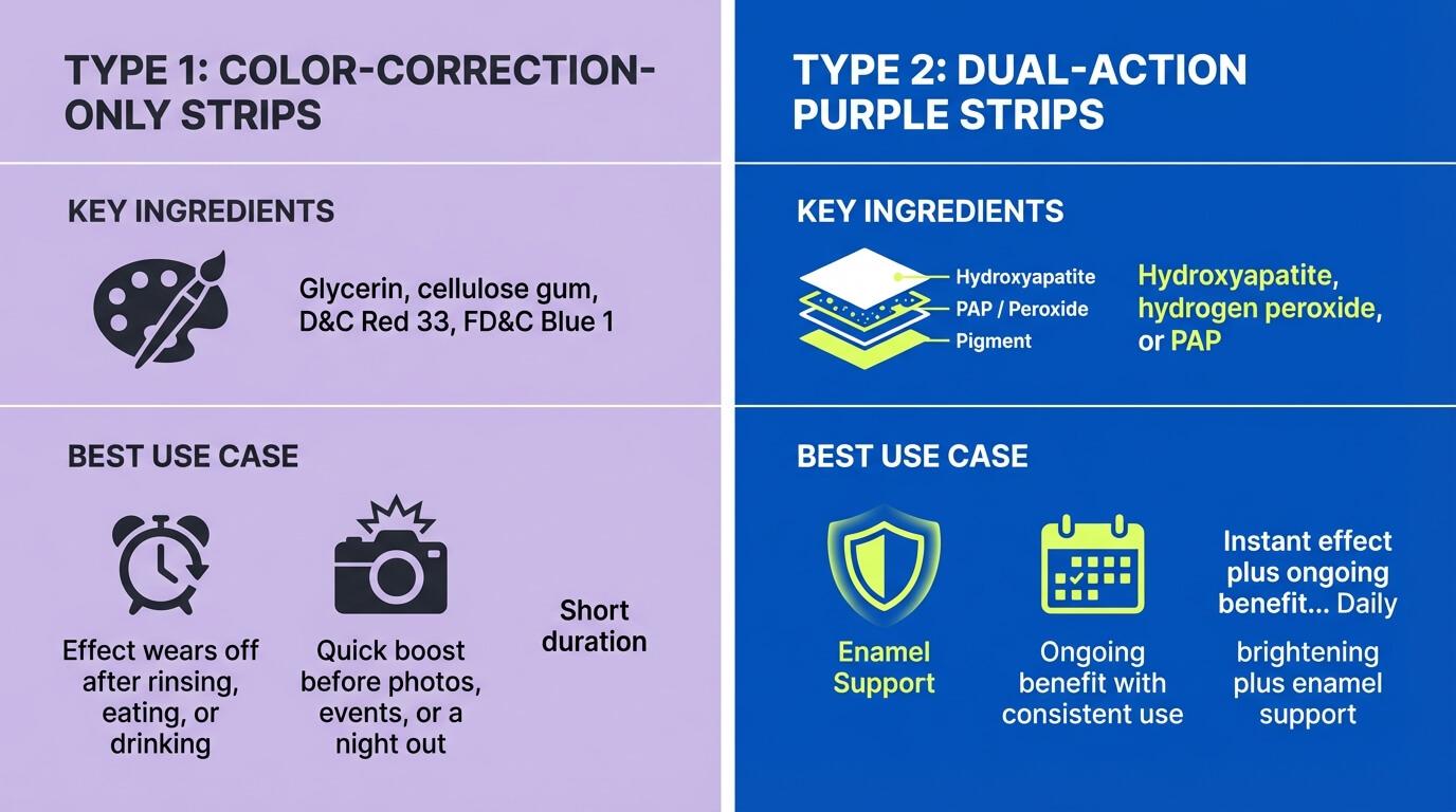 The real question is not "do purple strips work?" It is "what exactly is this purple strip doing while it is on your teeth?" There are 2 distinct categories.