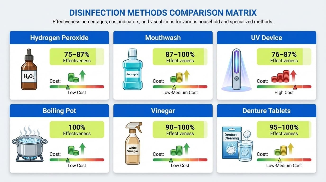 Each method has pros and cons depending on cost, ease of use, availability, and how well it actually removes harmful bacteria from your toothbrush bristles. Here’s how they stack up: