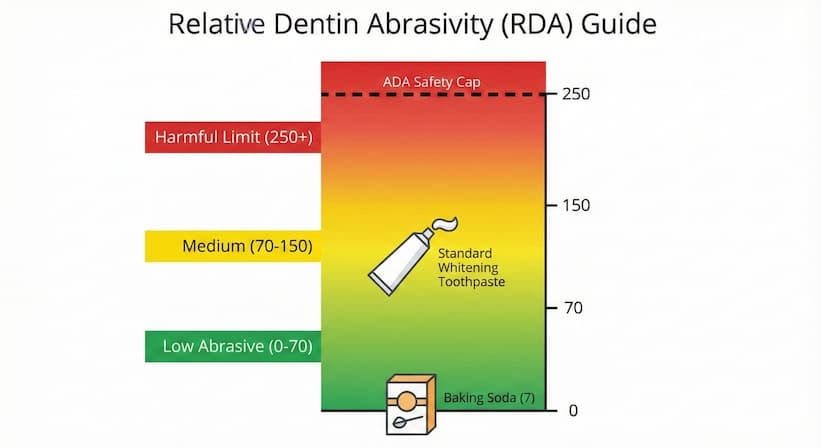 The American Dental Association (ADA) sets the safe limit for toothpaste abrasivity at an RDA of 250, noting that baking soda (RDA 7) is highly effective for stain removal without scratching enamel.