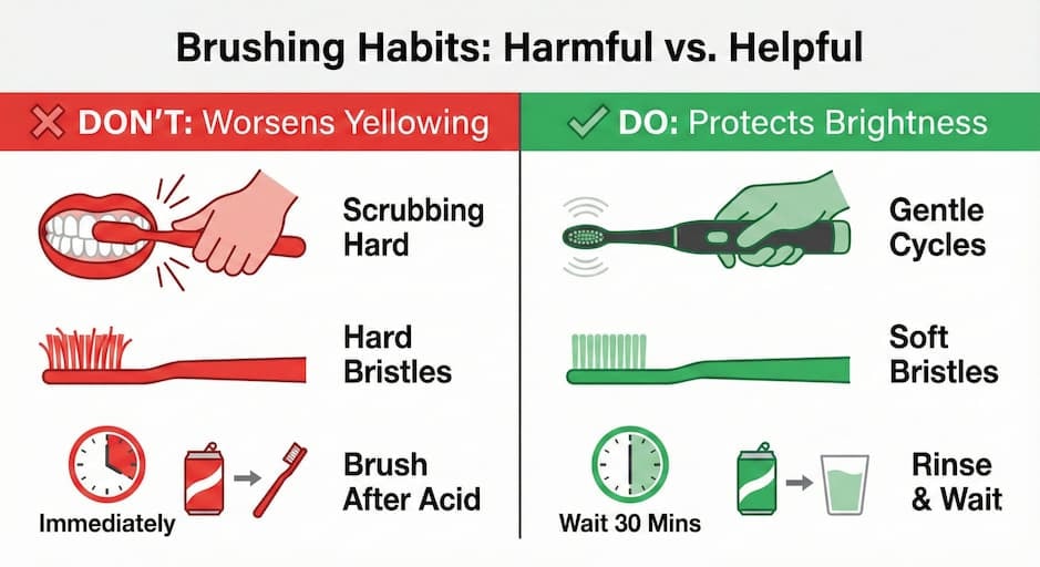 Brushing your teeth daily is essential, but how you brush matters just as much as how often you do. Some brushing habits seem helpful, but can actually make yellow teeth worse. Here's what to avoid and how to fix it with more competent care.