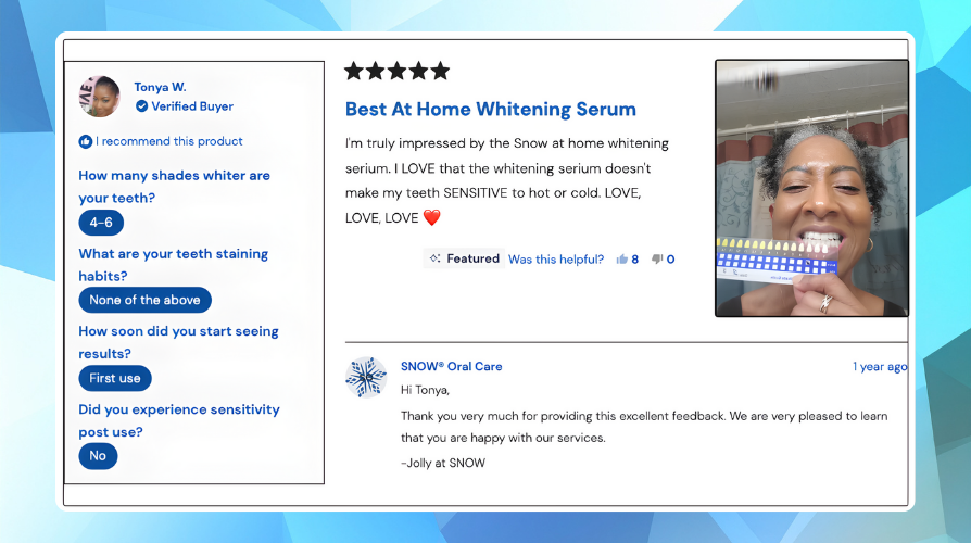 "After menopause, my teeth went yellow overnight. Three traditional systems failed. SNOW's dual-peroxide was the only thing that worked without hurting."